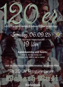 und  dem 60 jähriges Gründungsfest der Aschauer Goaßlschnoitzer im Aschauer Markt Festzelt am 06.09 2025.